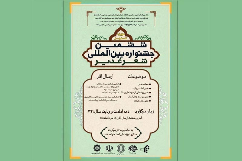 وقد دعت امانة مهرجان الغدير للشعر الشعراء والادباء ومحبي الولاية واهل بيت العصمة والطهارة (ع) لارسال اعمالهم حول موضوعات ملحمة الغدير، الامامة، الولاية، الغدير وحماية حريم اهل البيت (ع)، الغدير ووحدة العالم الاسلامي، الغدير ونهج البلاغة، الى هذه الامانة حتى يوم ۱۶ اغسطس على العنوان الالكتروني: