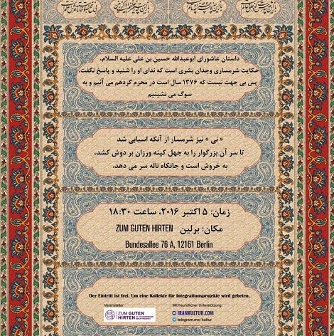 According to Seyed Ali Mojani, Iranian cultural attaché in berlin, it will be held on Wednesday evening with the aim of introducing the rituals of Shia Muslims in Muharram, the month of mourning for the martyrdom of Imam Hussein (AS) and his faithful companions in the 680 A.D. Battle of Karbala.