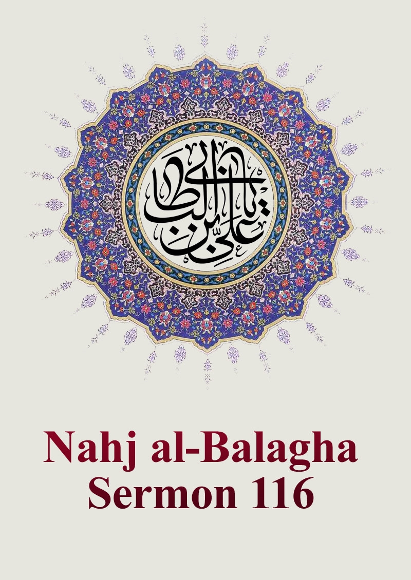 Alternative Sources for Sermon 116: Ibn ‘Abd Rabbih, al-’Iqd, VI, 249; al-Mas’udi, Muruj, III, 150; al-'Azhari, Tahdhib, VII, 101 (kh.d.r); Ibn Faqih, al-Buldan, 181; al-Harawi, al-Jam’, see Ibn al-'Athir, al-Nihayah, II, 41, V, 170; al-Muttaqi, Kanz, VI, 87; al-Daylami, al-'Irshad, I, 33.