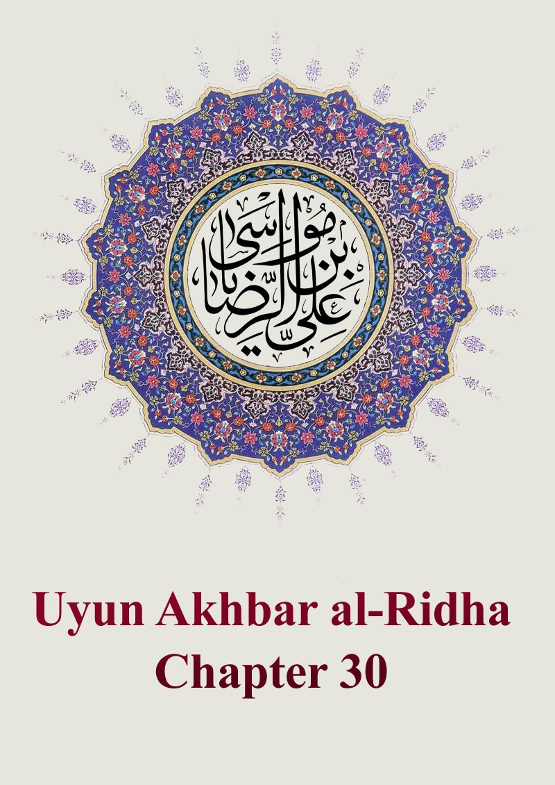 30-52 Abdul Wahid Muhammad ibn Ubdoos al-Neishaboori al-Attar - may God be pleased with him - narrated that Ali ibn Muhammad ibn Qutayba al-Neishaboori quoted on the authority of Al-Fadhl ibn Shazan that he had heard Al-Ridha’ (AS) say, “Acting justly and speaking fairly result in the continuation of blessings. And there is no power nor any strength save by God.” The first volume of Uyun Akhbar Al-Ridha’ (AS) authored by Abi Ja’far Muhammad ibn Ali ibn Al-Husayn ibn Musa ibn Babawayh al-Qumi residing in Ray has ended at this point. May God assist him to obey God and grant him success to please God. In the beginning of the second volume, I will present more traditions about Al-Ridha’ (AS).