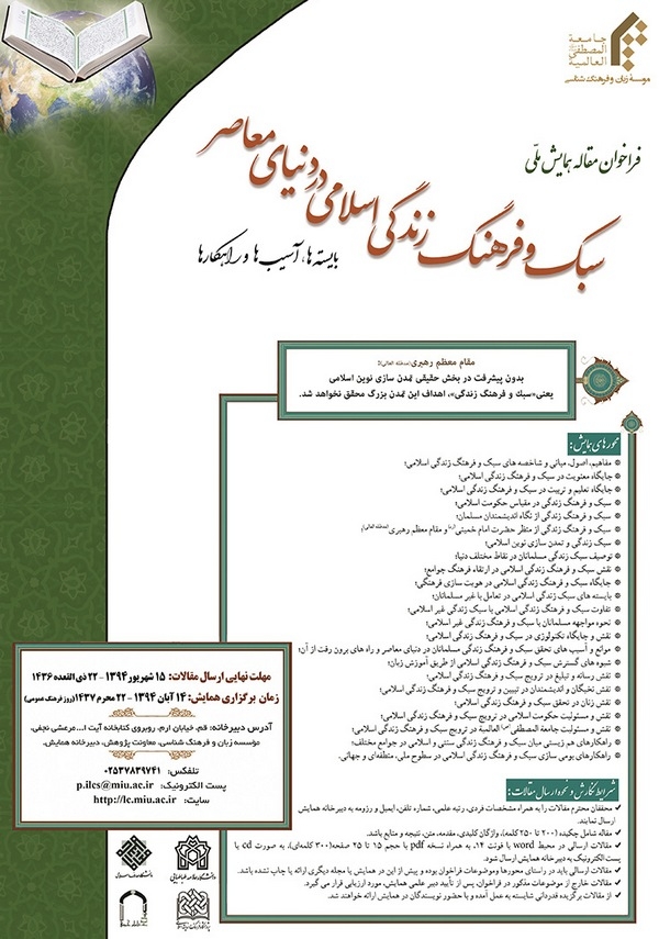 در راستای حفظ فرهنگ و هویت اسلامی، نهادینهسازی سبک زندگی متناسب با اعتقادات و باورهای دینی و جلوگیری از تهاجم فرهنگ و ارزشهای بیگانه در سبک زندگی مسلمانان، از تمامی پژوهشگران حوزوی و دانشگاهی سراسر کشور برای نگارش مقاله دعوت به عمل میآید.