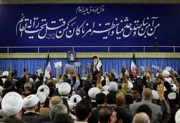 گذشته از رهنمودهایی که رهبر انقلاب در اینگونه دیدارها ارائه می کنند، یکی از عناصری که پیام های مهمی را به شرکت کنندگان و نیز بینندگان تصویری آن منتقل می کند، آیه یا حدیثی که بالای جایگاه جلوس رهبر انقلاب نوشته می شود و فضای دیدار را متبرک می کند.