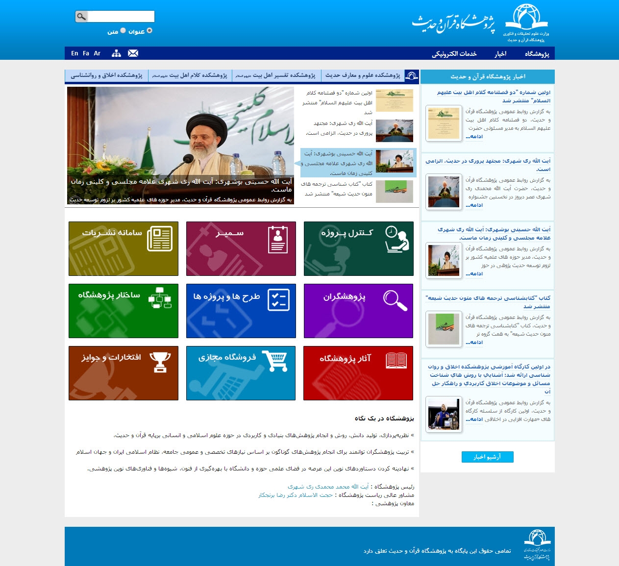 اطلاع رسانی اخبار و رویدادهای پژوهشگاه به همراه معرفی آثار، اساتید، پژوهشکده ها (پژوهشکده علوم و معارف حديث، پژوهشکده تفسیر اهل بيت علیهم السلام، پژوهشکده کلام اهل بيت علیهم السلام، پژوهشکده اخلاق و روان شناسی اسلامی) و محصولات پژوهشگاه