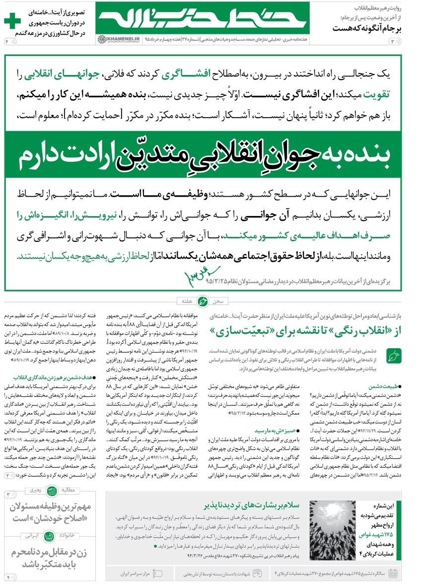 تصویر ویژه این شماره به حضور آیتالله خامنهای در زمان ریاستجمهوری در مزرعهی یک خانوادهی شهید در روستای فردو و دروی گندم توسط ایشان اختصاص پیدا کرده است.