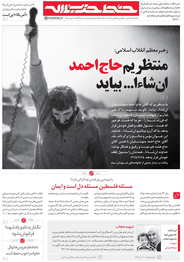 در آستانه فرا رسیدن روز قدس، سی و نهمین شماره هفته نامه خط حزب‌الله با گزارشی از نگاه رهبر انقلاب به حاج احمد متوسلیان و نیز یادداشتی درباره‌ی اثرات راه‌پیمایی روز قدس منتشر شد.