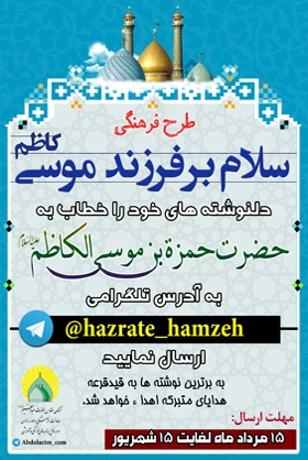 علاقه مندان ميتوانند با ارسال دلنوشته هاي خود خطاب به حضرت حمزه بن موسي الكاظم عليه السلام به آدرس تلگرامي @hazrate_hamzeh در اين طرح فرهنگي شركت نمايند .