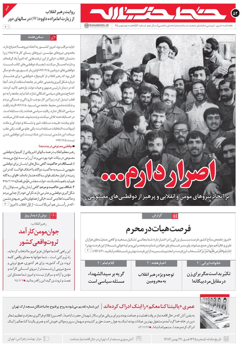 پنجاه و دومین شمارهی هفتهنامهی خبری - تبیینی خط حزبالله در سخن این هفته خود به اصرار رهبر انقلاب بر اتحاد نیروهای مومن و انقلابی و پرهیز از دوقطبیهای مصنوعی پرداخته است.