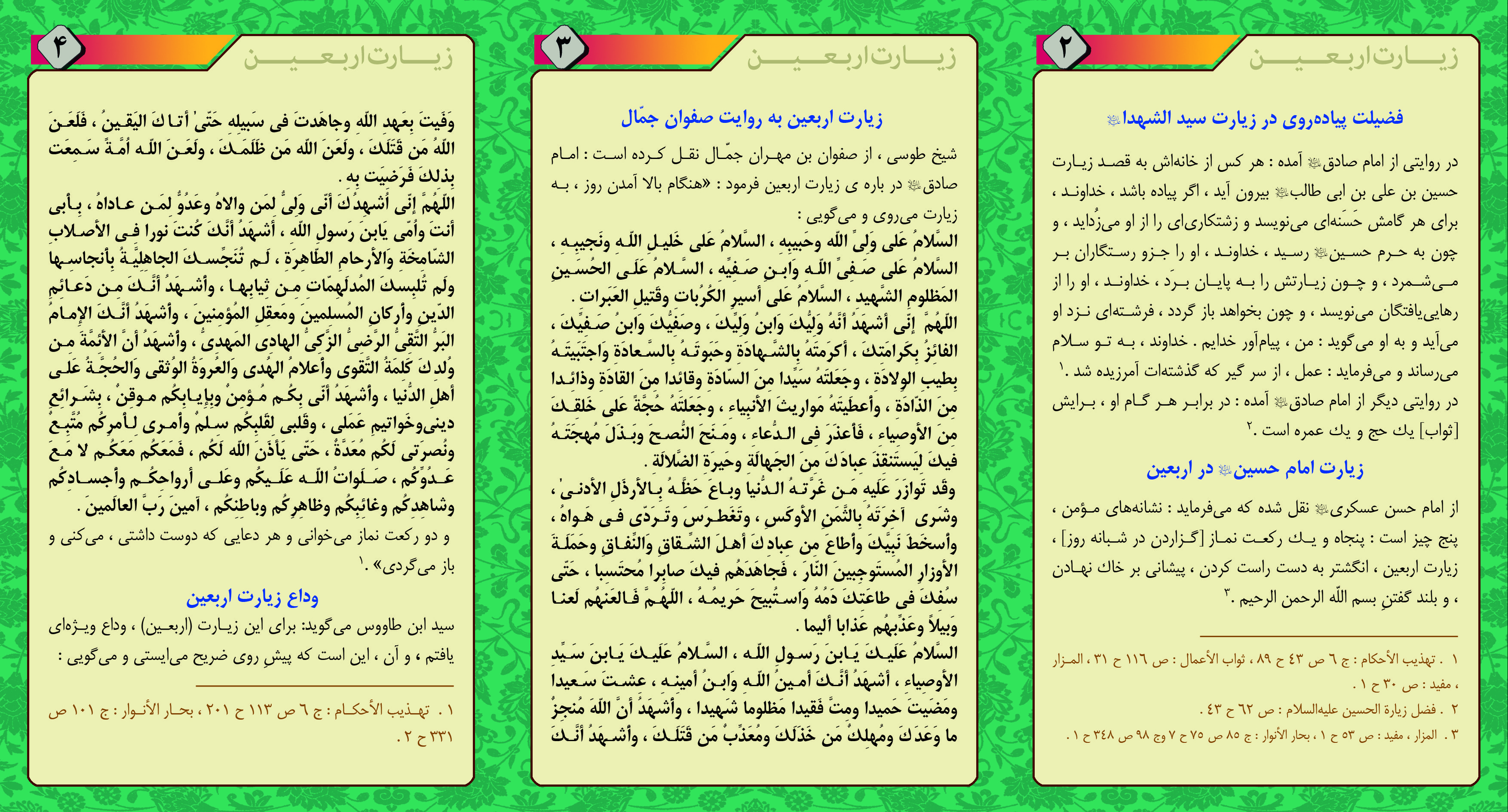 تهذيب الأحكامـ به نقل از صفوان بن مِهران جمّال ـ: مولايم امام صادق ـ كه درودهاى خدا بر او باد ـ ، در باره زيارت اربعين فرمود : «هنگام بالا آمدن روز ، به زيارت مى روى و مى گويى :