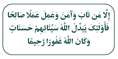 خداوند سبحان در آيات ۶۸ تا ۷۱ سوره فرقان نخست سرنوشت گناه كاران و عذاب مضاعف آن ها در دوزخ را آورده است ؛ سپس مى فرمايد سيئات كسانى را كه توبه مى كنند و ايمان مى آورند و كردار نيكو دارند، به حسنات تبديل مى كند. پس از آن، با عبارتى كه به منزله تعليل است مى فرمايد كه چنين كسى به سوى خدا توبه كرده است و همين بازگشت به خداست كه مايه دگرگونى بدى ها به خوبى هاست.