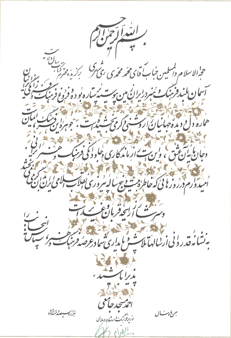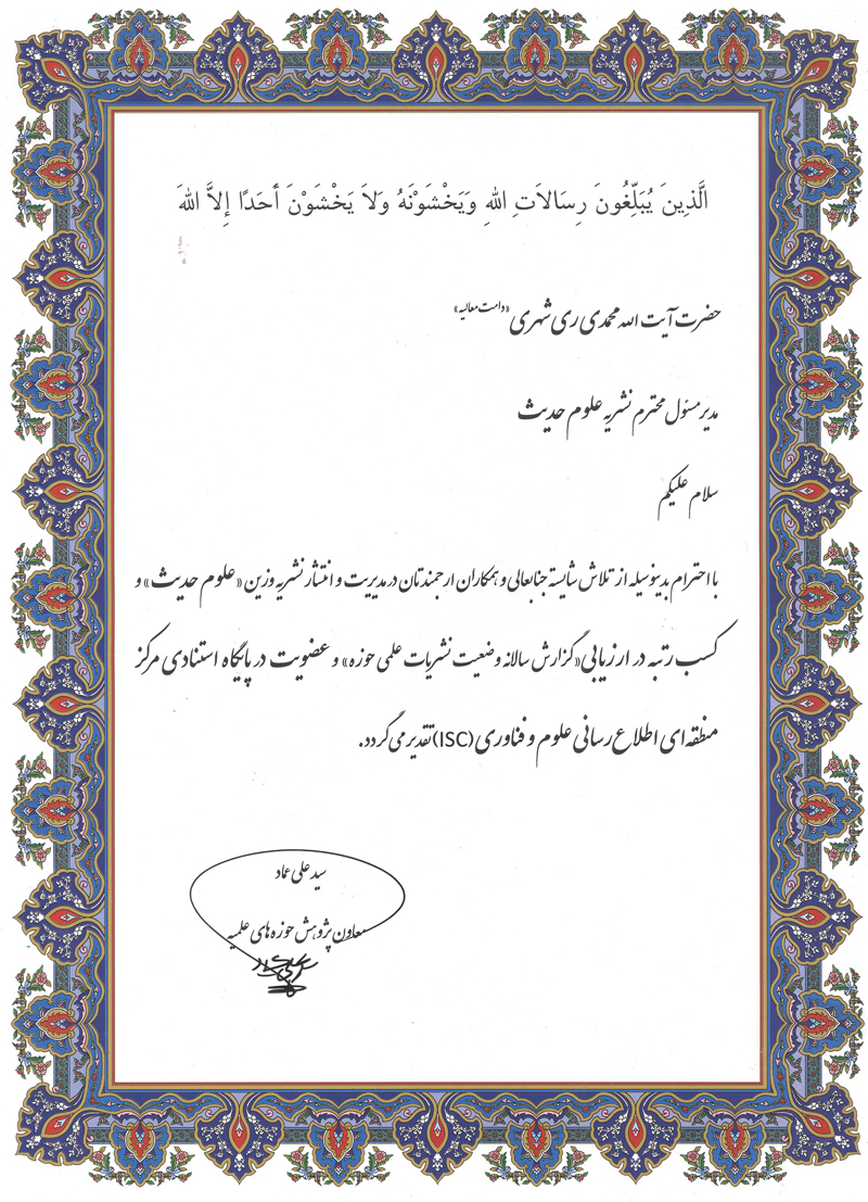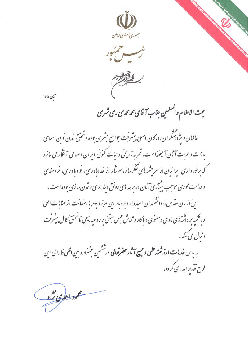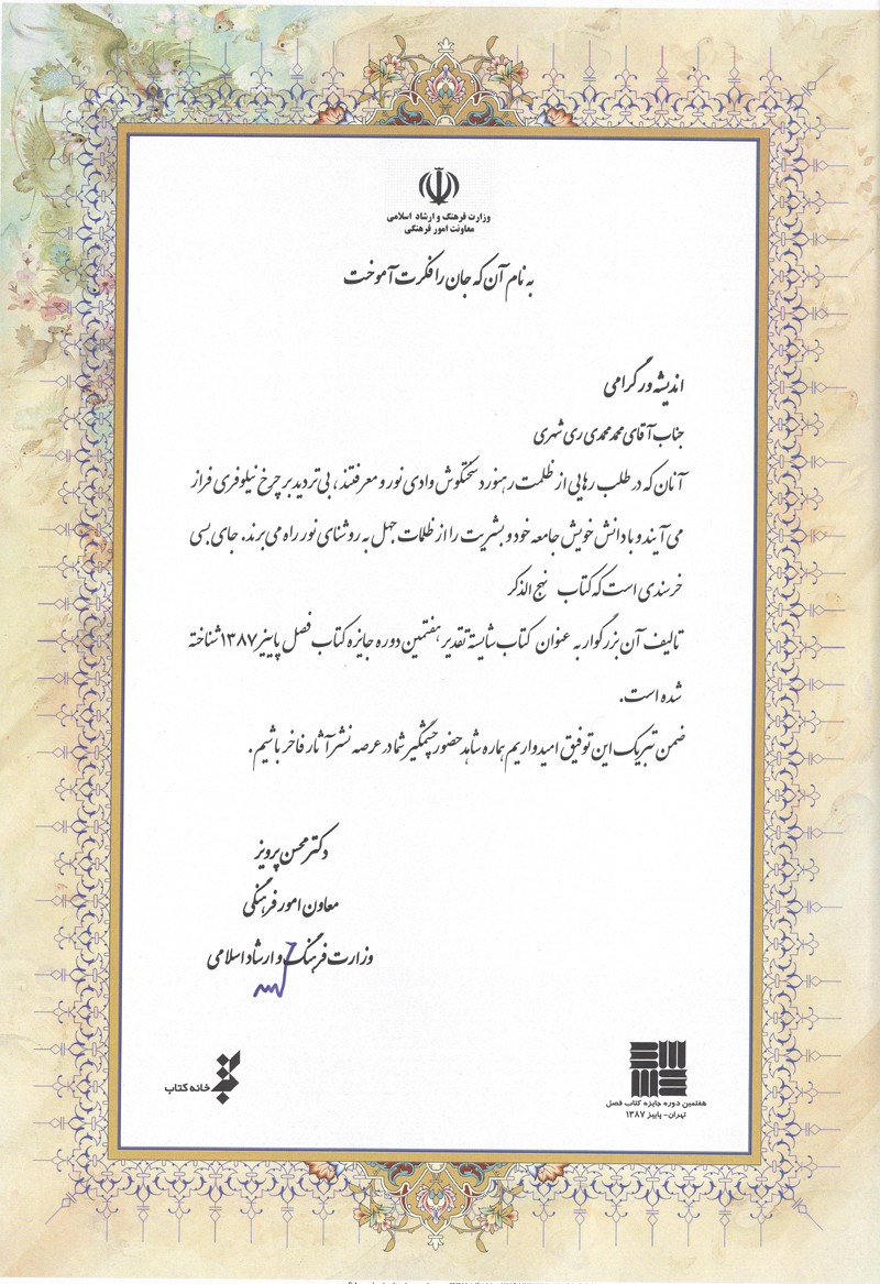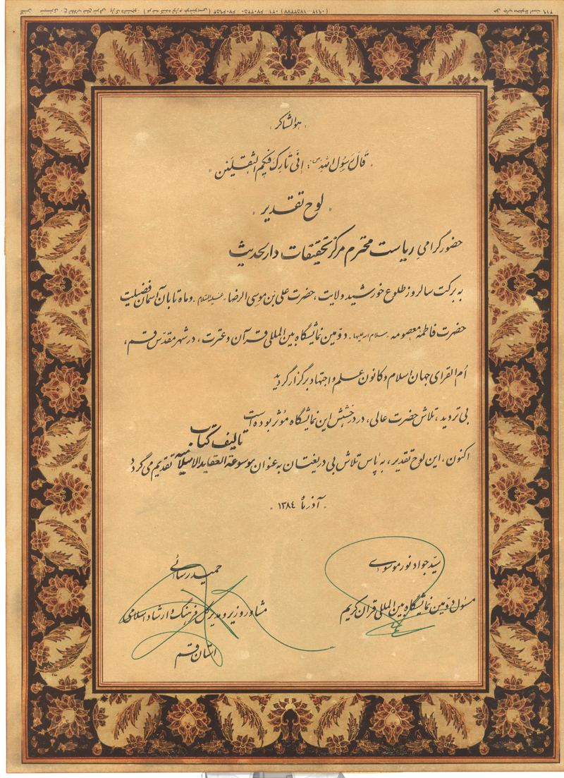 برخی از تقدیرنامه های آیت الله ری شهری و مؤسسه علمی فرهنگی دارالحدیث