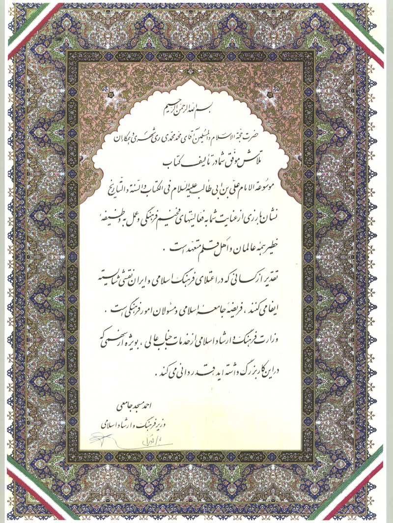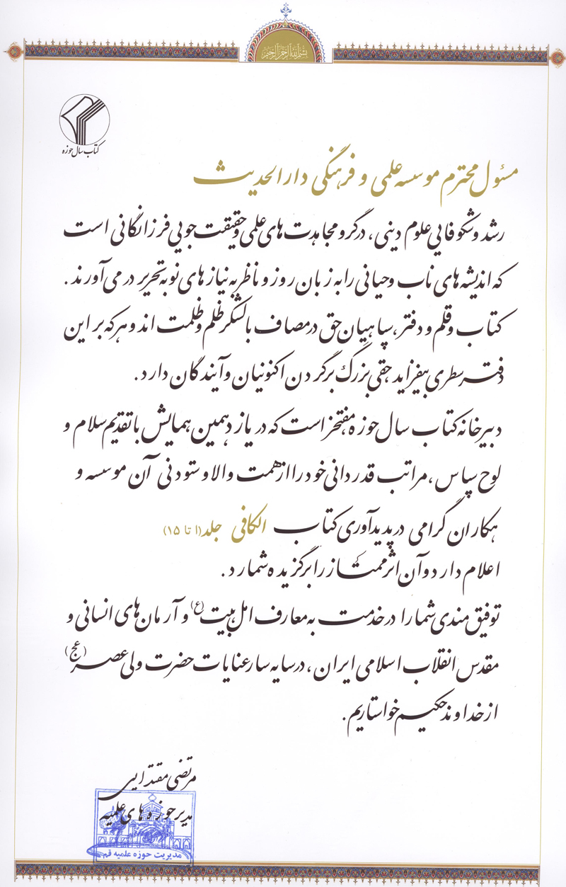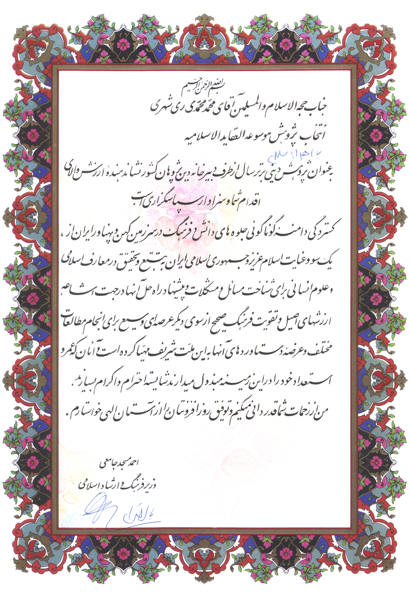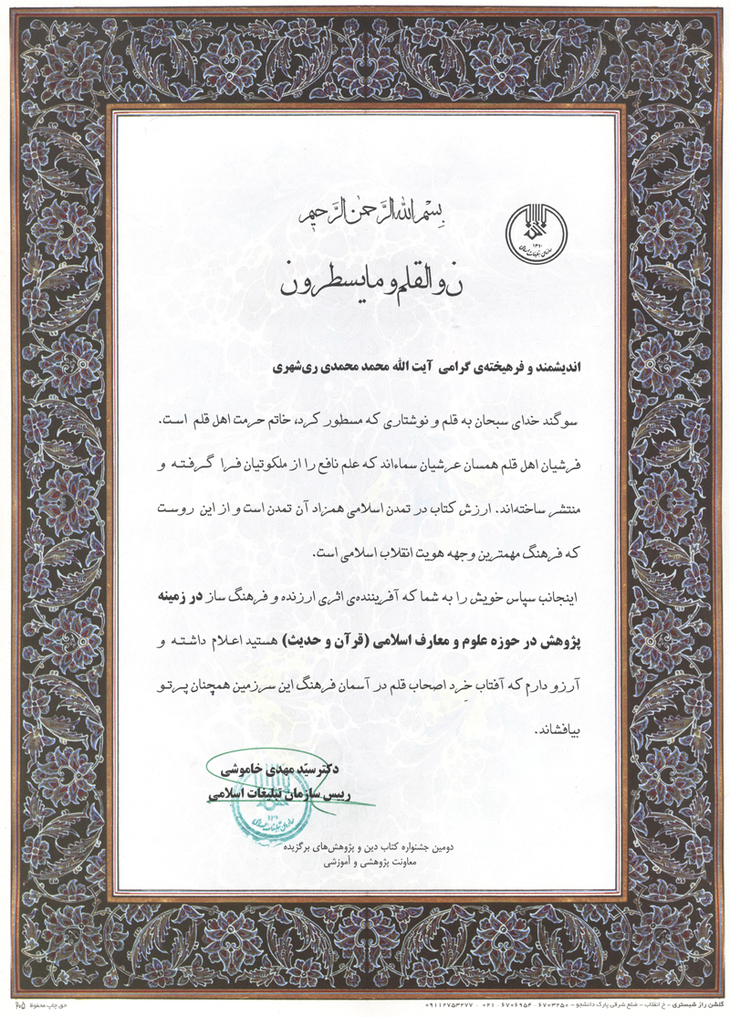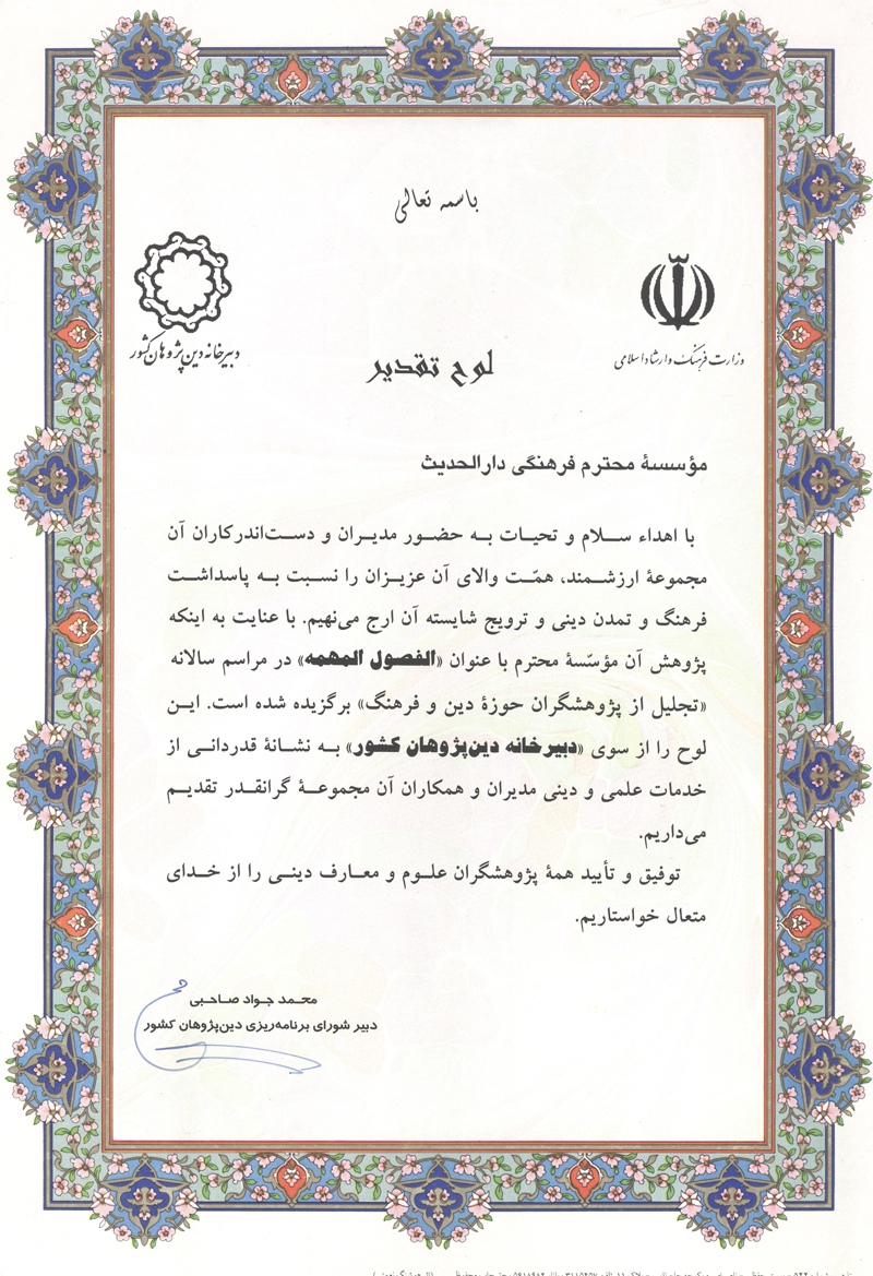 برخی از تقدیرنامه های آیت الله ری شهری و مؤسسه علمی فرهنگی دارالحدیث