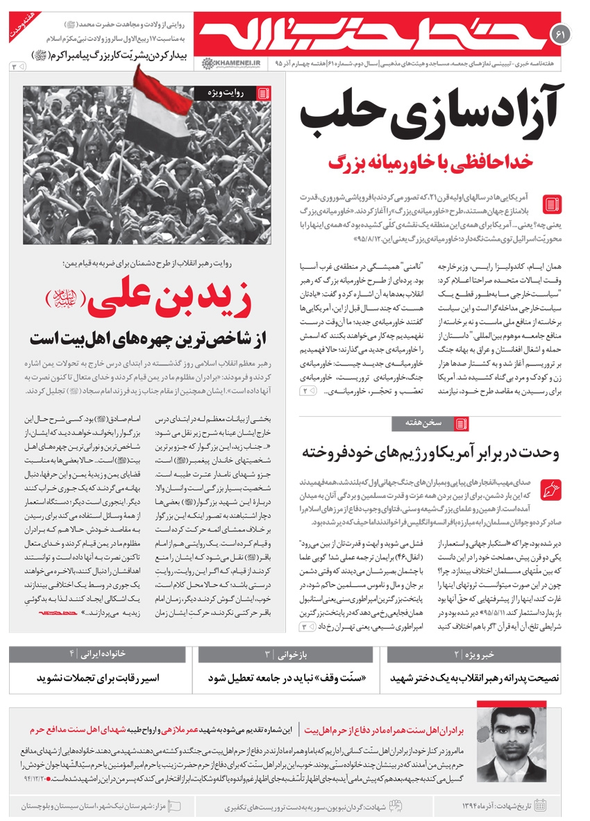 شصتویکمین شمارهی هفتهنامهی خط حزبالله به روح پرفتوح شهید عمر ملازهی، و ارواح طیبهی شهدای اهلسنت مدافع حرم تقدیم شده است.