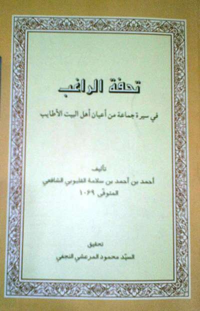 نویسنده در کتاب تحفه الراغب شرح حال هفده تن از سادات خاندان عصمت و طهارت علیهم السلام را - که در مصر مدفون هستند - نوشته است. کتاب را با شرح حالی از امام حسین علیه السلام آغاز کرده، چرا که به قولی سر مبارک امام حسین علیه السلام در این دیار مدفون است.