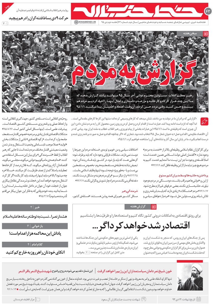 شصت و سومین شمارهی هفتهنامهی خبری-تبیینی خط حزبالله با سخن هفتهای در خصوص اهمیت پرداختن دولتمردان به مسائل اقتصاد مقاومتی و معیشت مردم و ارائه تلاشها و دستاوردهای خود به مردم، با عنوان «گزارش به مردم» منتشر شد.