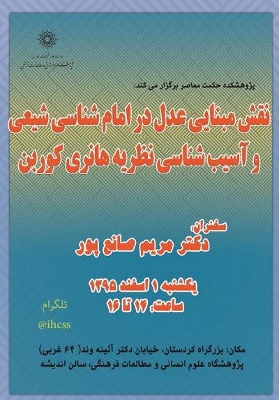به گزارش خبرگزاری بینالمللی قرآن (ایکنا)، نشست «نقش مبنایی عدل در امامشناسی شیعی و آسیبشناسی نظریه هانری کوربن» به همت پژوهشکده حکمت معاصر پژوهشگاه علوم انسانی و مطالعات فرهنگی با سخنرانی مریم صانعپور برگزار میشود.