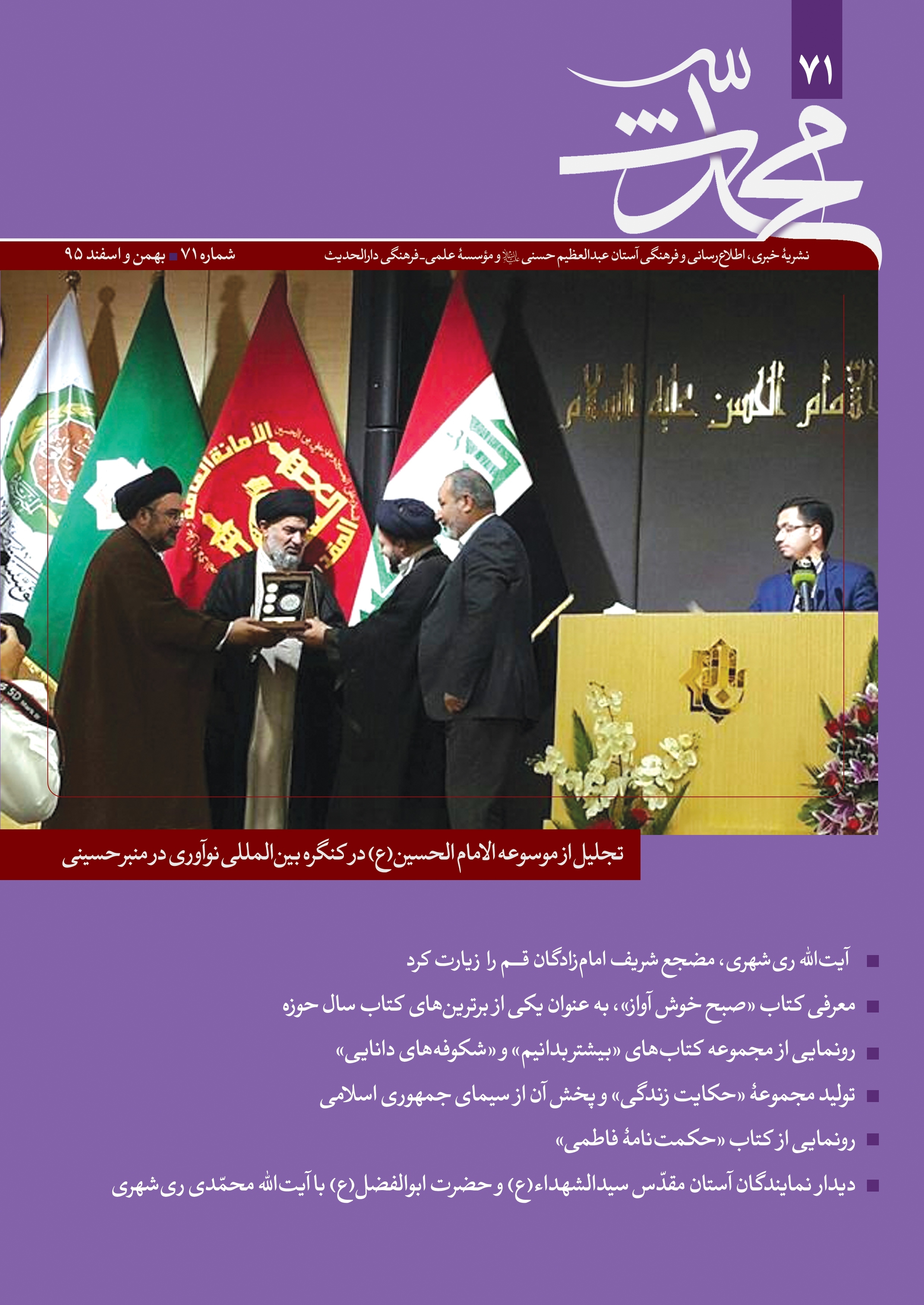 هفتاد و یکمین شماره «محدث» (بهمن واسفند 1395)، به رویدادهای حوزه ریاست، دانشگاه و پژوهشگاه قرآن و حدیث، خبرهای فرهنگی و انتشارات موسسه علمی - فرهنگی دارالحدیث و همچنین اخبار آستان حضرت عبدالعظیم(ع) اختصاص دارد.