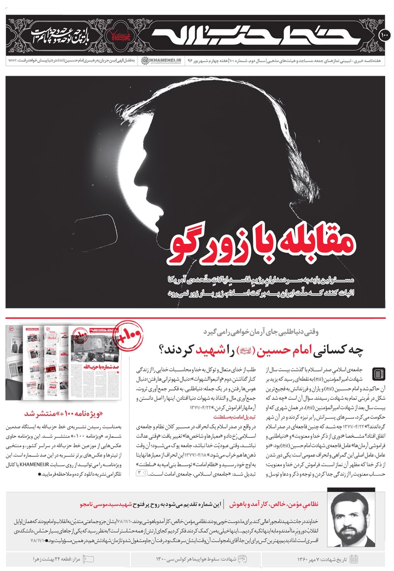 همزمان با فرارسیدن ایام محرم و هفتهی دفاع مقدس، عمدهی مطالب شماره صدم نشریهی خط حزبالله، به این دو موضوع اختصاص یافته است. انتشار اولین بار بیانات رهبرانقلاب در دیدار جمعی از اصناف پشتیبان دفاع مقدس در سال ۹۲، و چرا صدام به ایران حمله کرد؟، موضوعات مرتبط با هفتهی دفاع مقدس است.