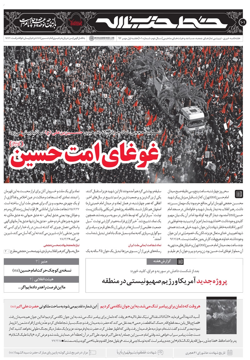 شماره ۱۰۱ نشریه خط حزبالله همزمان با فرارسیدن تاسوعا و عاشورای حسینی و تشییع شهید محسن حججی، مدافع حرم اهل بیت (ع) با مطلبی دربارهی این شهید بزرگوار و مطالبی از امام حسین(ع) از منظر رهبر انقلاب منتشر شد.