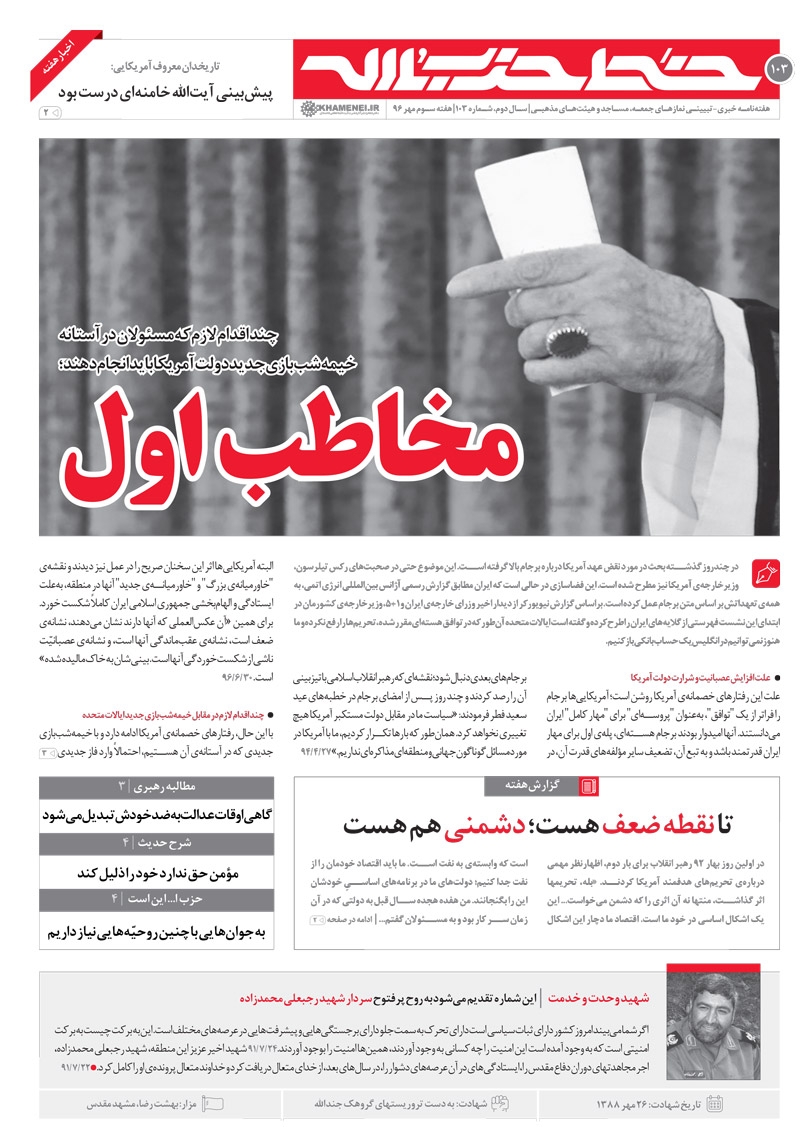 صدوسومین شماره خط حزبالله با سخن هفتهای با عنوان «مخاطب اول» که به رفتار خصمانهی آمریکا در قبال برجام و همچنین چند اقدام لازم که مسئولان در آستانه خیمه شب بازی جدید آمریکا باید انجام بدهند منتشر شد.