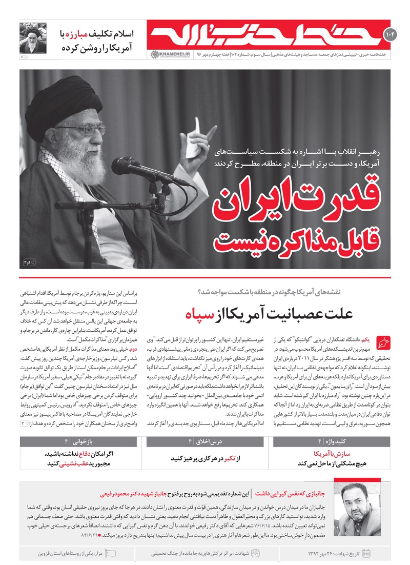 صدوچهارمین شماره خط حزبالله با سخن هفتهای با عنوان «علت عصبانیت آمریکا از سپاه» به چرایی شکست نقشههای آمریکا در منطقه پرداخته است. در بحشی از مطلب این چنین آمده است: دانشگاه تفنگداران دریایی "کوانتیکو" که یکی از مهمترین اندیشکدههای آمریکا محسوب میشود، در تحقیقی که توسط سه افسر پژوهشگر در سال ۲۰۱۱ دربارهی ایران نوشتند، اینگونه اعلام کرد که مواجههی نظامی با ایران، نه تنها دستاوردی برای آمریکا ندارد بلکه هزینههای آن برای آمریکا و غرب، بیش از سود آن است. "رای سایمون"، یکی از نویسندگان این تحقیق، در اینباره چنین نوشته بود: "راه مبارزه با ایران گم شده است. شاید بتوان در کوتاهمدت از طریق نظامی ضربهای به ایران زد اما از آنجا که توان دفاعی ایران در میانمدت و بلندمدت بسیار بالاتر از کشورهایی همچون سوریه، عراق و لیبی است، تهدید نظامی مستقیم یا غیرمستقیم ایران، تنها این کشور را پرتوانتر از قبل میکند."