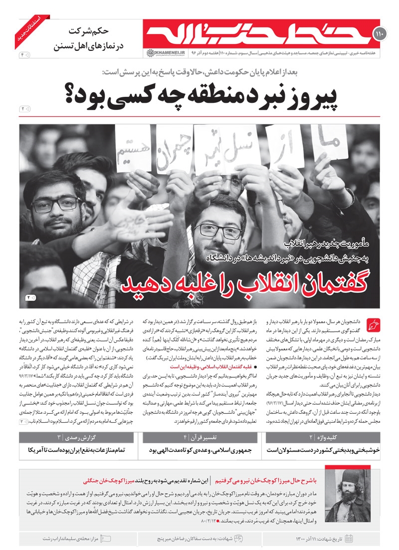 صدودهمین شماره از نشریه خط حزبالله در هشتمین روز از آذرماه ۱۳۹۶ منتشر شد.