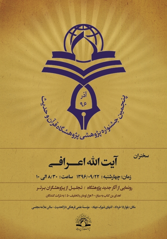 به گزارش پایگاه اطلاع رسانی دارالحدیث، پنجمین جشنواره پژوهشی پژوهشی پژوهشگاه قرآن و حدیث روز چهارشنبه ۲۲ آذرماه از ساعت ۸:۳۰ تا ۱۰ صبح در تالار علامه مجلسی(ره) مؤسسه علمی ـ فرهنگی دارالحدیث پذیرای عموم است.