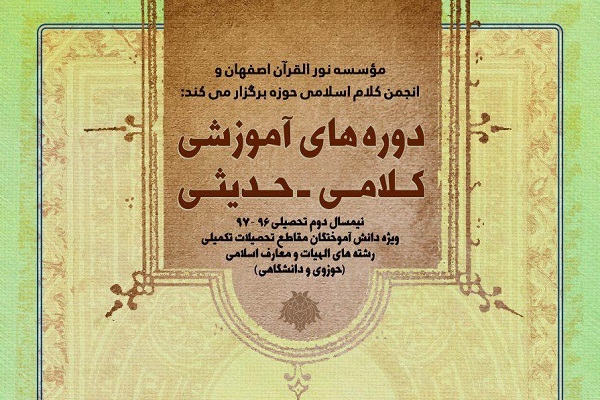به گزارش خبرگزاری بینالمللی قرآن(ایکنا) دورههای آموزشی کلامی ـ حدیثی، ویژه دانش آموختگان مقاطع تحصیلات تکمیلی رشتههای الهیات و معارف اسلامی(حوزوی و دانشگاهی) به همت موسسه نورالقرآن اصفهان و انجمن کلامی اسلامی برگزار میشود.