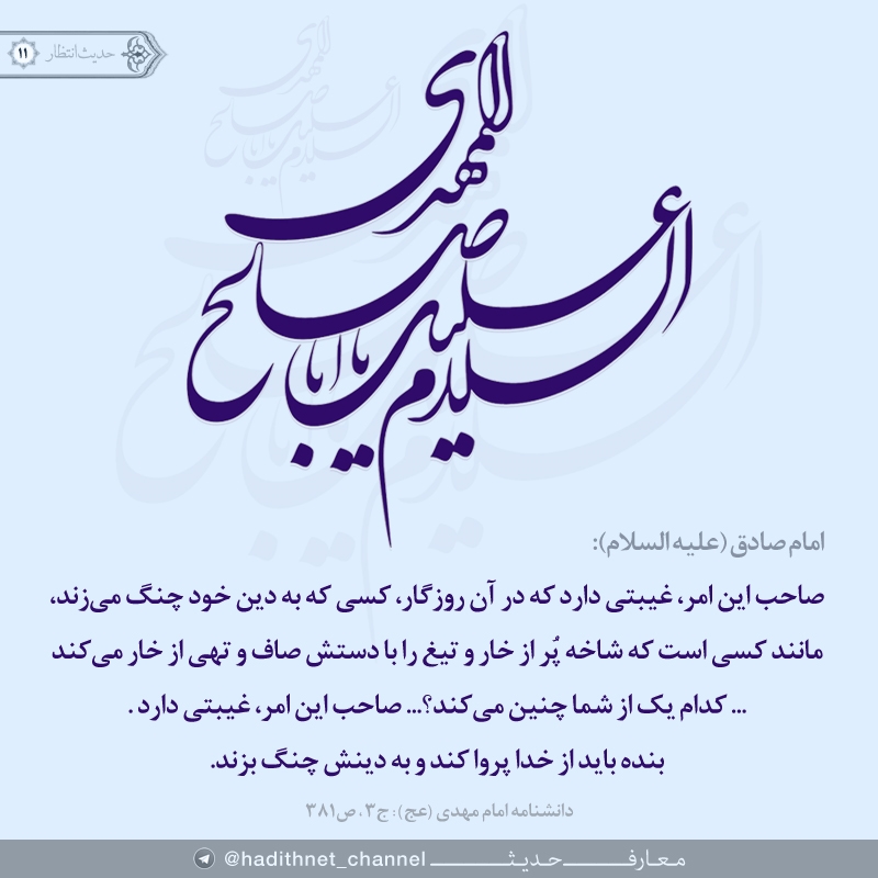 إنَّ لِصاحِبِ هذَا الأَمرِ غَيبَةً ، المُتَمَسِّكُ فيها بِدينِهِ كَالخارِطِ لِلقَتادِ ...فَأَيُّكُم يُمسِكُ شَوكَ القَتادِ بِيَدِهِ ؟...إنَّ لِصاحِبِ هذَا الأَمرِ غَيبَةً ، فَليَتَّقِ اللَّهَ عَبدٌ وَليَتَمَسَّك بدينِهِ ؛