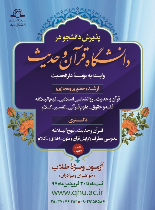 معاون آموزشی و پژوهشی دانشگاه قرآن و حدیث خاطرنشان کرد: متقاضیان دارای شرایط در نظر گرفته شده برای ثبتنام میتوانند به پایگاه اطلاعرسانی دانشگاه به نشانیwww.qhu.ac.irمراجعه و از جزئیات بیشتر ومنابع آزمون مطلع شوند.