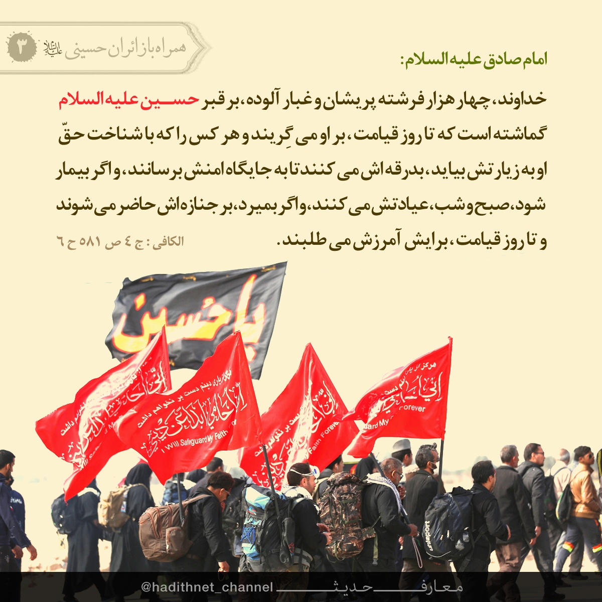 خداوند ، چهار هزار فرشته پريشان و غبار آلوده ، بر قبر حسـين عليه السلام گماشته است كه تا روز قيامت ، بر او مى گِريند و هر كس را كه با شناخت حقّ او به زيارتش بيايد ، بدرقه اش مى كنندتا به جايگاه امنش برسانند ، و اگر بيمار شود ، صبح و شب ، عيادتش مى كنند ، و اگر بميرد ، بر جنازه اش حاضر مى شوند و تا روز قيامت ، برايش آمرزش مى طلبند .