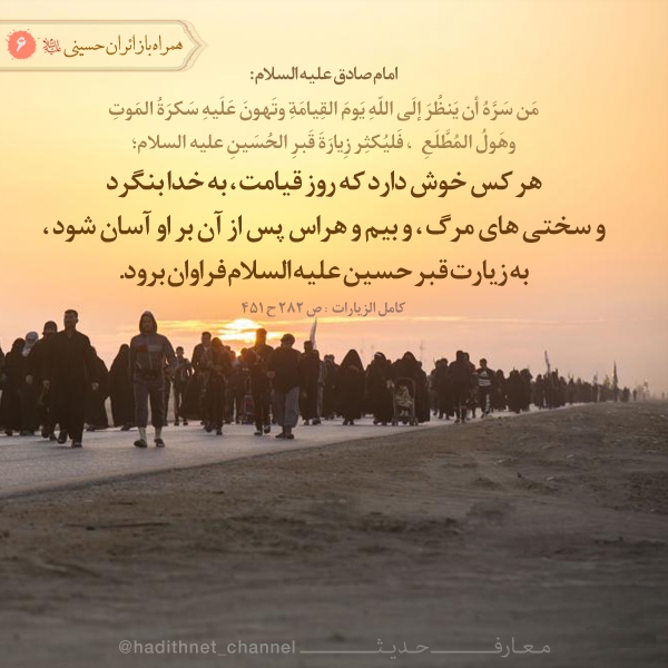 هر كس خوش دارد كه روز قيامت ، به خدا بنگرد و سختى هاى مرگ ، و بيم و هراس پس از آن بر او آسان شود ، به زيارت قبر حسين عليه السلام فراوان برود.