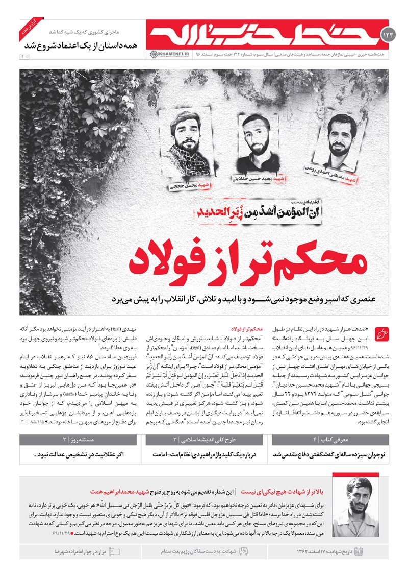 صدوبیستوسومین شماره از نشریه خط حزبالله با مطلبی با عنوان «محکمتر از فولاد» عنصری که اسیر وضع موجود نمیشود و با امید و تلاش، کار انقلاب را به پیش میبرد، منتشر شد. در بخشی از متن چنین میخوانیم: انقلاب اسلامی سال ۵۷ آغاز شد نه تمام. «بعضی خیال میکنند انقلاب فقط سال ۵۷ بود و تمام شد؛ این خطا است. انقلاب در سال ۵۷ شروع شد، نه اینکه تمام شد؛ آغاز تغییر، آغاز حرکت اصلاحی در جامعه در سال ۵۷ اتّفاق افتاد... بتدریج این حرکت باید عمیقتر، وسیعتر، گستردهتر، خردمندانهتر ادامه پیدا کند، نه اینکه متوقّف بشود.»(۱۳۹۶/۱۱/۲۹) پس اگر قرار است این انقلاب همچنان حرکت کند و حرکتش هم عمیقتر و وسیعتر و گستردهتر شود - که شده است -، نیازمند "نیروی محرکهای" است، و نیروی محرکهی این انقلاب هم "زبر الحدید"هایی از نسل حدادیاناند. نسلی که رهبر انقلاب در وصف آنان میفرمایند...