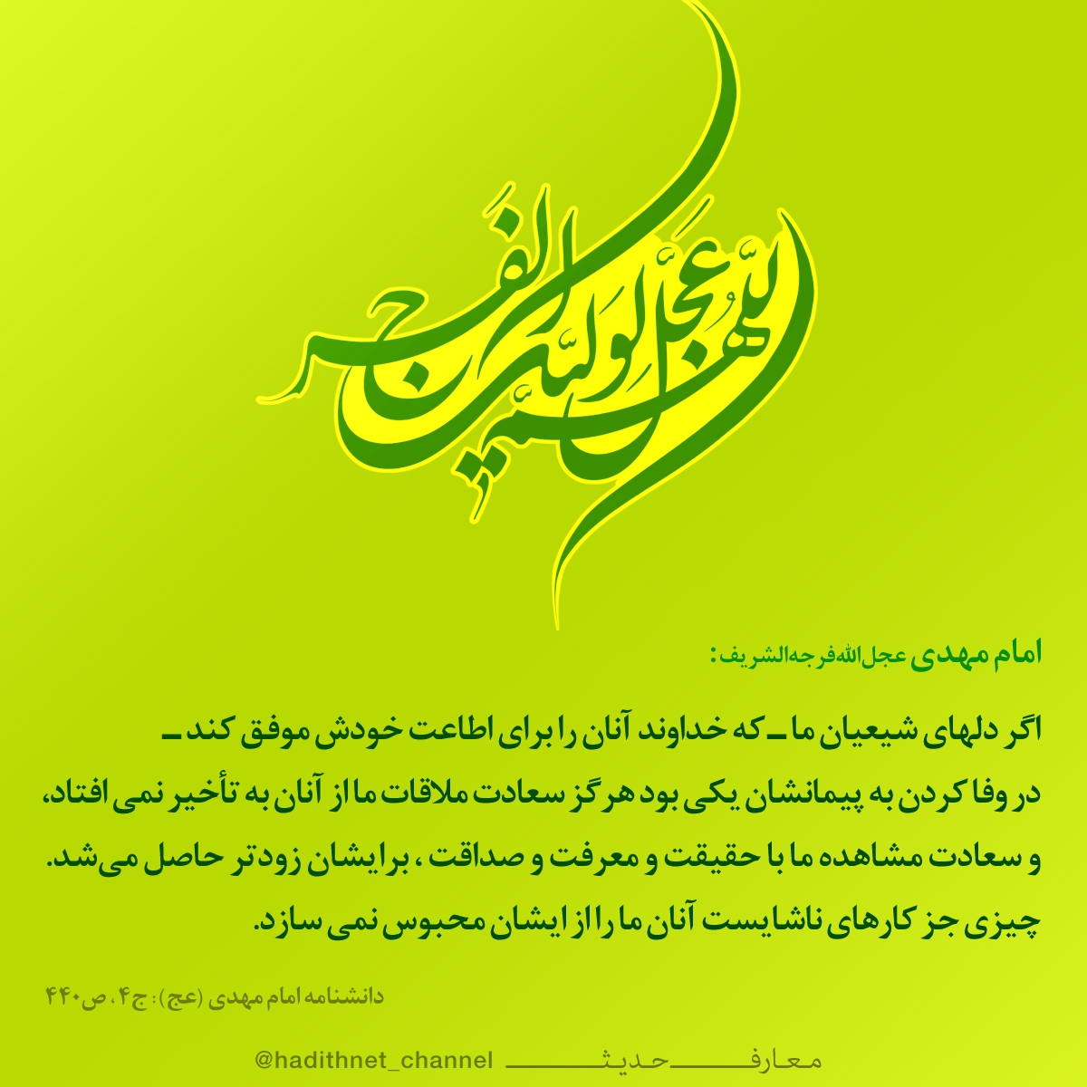 اگر دلهاى شيعيان ما ـ كه خداوند آنان را براى اطاعت خودش موفق كند ـ در وفا كردن به پيمانشان يكى بود هرگز سعادت ملاقات ما از آنان به تأخير نمى افتاد، و سعادت مشاهده ما با حقيقت و معرفت و صداقت ، برايشان زودتر حاصل مىشد. چيزى جز كارهاى ناشايست آنان ما را از ايشان محبوس نمى سازد.