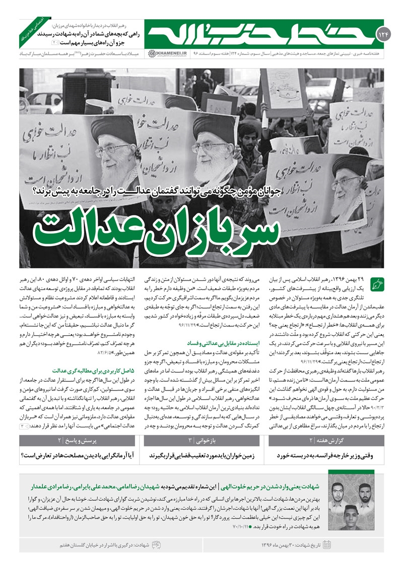 سخن هفته این شماره نیز با عنوان «سربازان عدالت» که به چگونگی پیشبرد گفتمان عدالت توسط جوانان مؤمن و انقلابی در جامعه میپردازد.