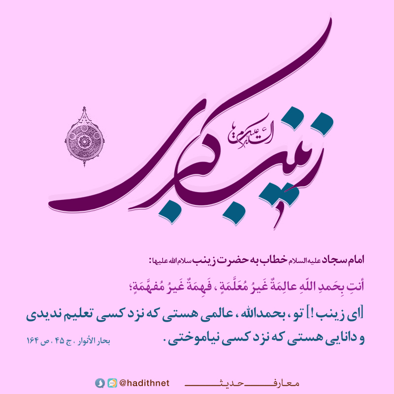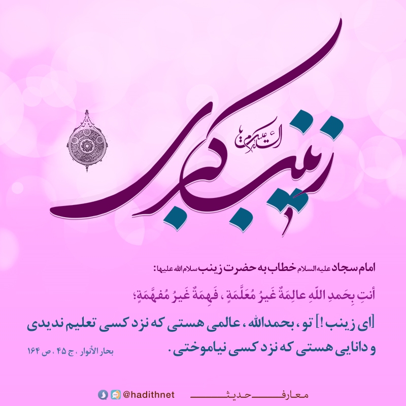 [اى زينب !] تو ، بحمدالله ، عالمى هستى كه نزد كسى تعليم نديدى و دانايى هستى كه نزد كسى نياموختى.