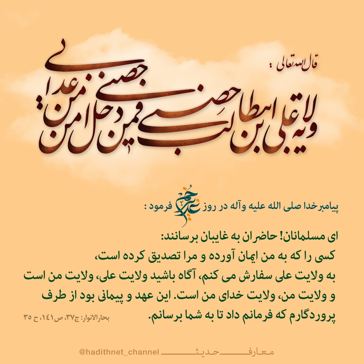 يا مَعشَرَ المُسلِمينَ، لِيُبَلِّغِ الشّاهِدُ الغائِبَ : اُوصي مَن آمَنَ بي وصَدَّقَني فَليَتَوَلَّ عَلِيّا مِن بَعدي ؛ فَإِنَّ وِلايَتَهُ وِلايَتي ، ووِلايَتي وِلايَةُ اللّهِ ! أمرٌ عَهِدَهُ إلَيَّ رَبّي ، وأمَرَني أن اُبَلِّغَكُموهُ؛