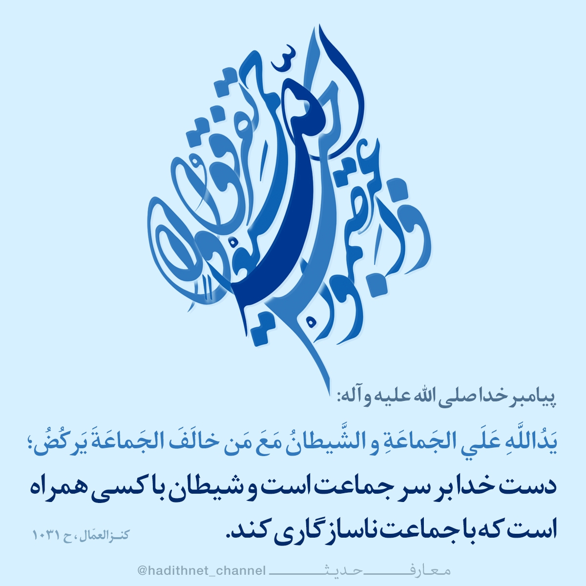 دست خدا بر سر جماعت است و شيطان با كسي همراه است كه با جماعت ناسازگاري كند.