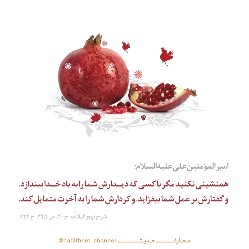 همنشينى نكنيد مگر با كسى كه ديـدارش شما را به ياد خـدا بيندازد. و گفتارش بر عمل شما بيفزايد. و كردارش شما را به آخرت متمايل كند.