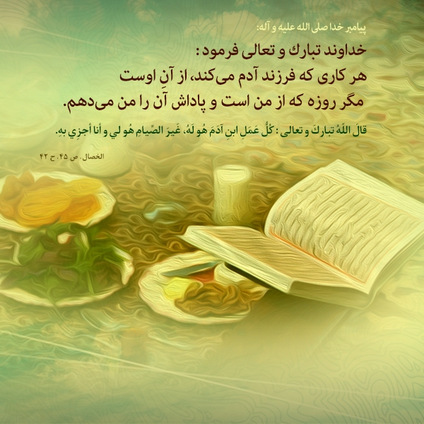 خداوند تبارك و تعالی فرمود : هر كارى كه فرزند آدم میكند، از آنِ اوست مگر روزه كه از من است و پاداش آن را من میدهم.