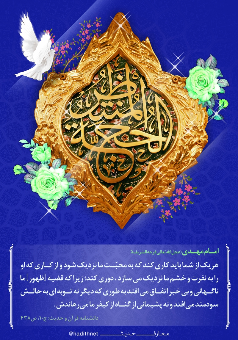 هريك از شما بايد كارى كند كه به محبّت ما نزديك شود و از كارى كه او را به نفرت و خشم ما نزديك مى سازد ، دورى كند؛ زيرا كه قضيه [ظهور] ما ناگهانى و بى خبر اتفاق مى افتد به طورى كه ديگر نه توبه اى به حالش سودمند مىافتد و نه پشيمانى از گناه از كيفر ما مىرهاندش .