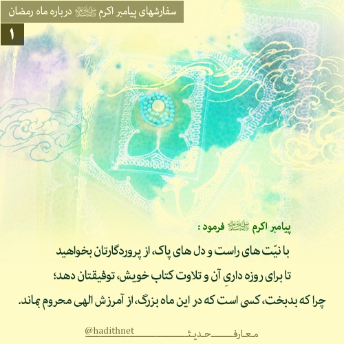 با نيّت هاى راست و دل هاى پاك، از پروردگارتان بخواهيد تا براى روزه دارىِ آن و تلاوت كتاب خويش، توفيقتان دهد؛ چرا كه بدبخت، كسى است كه در اين ماه بزرگ، از آمرزش الهى محروم بماند.