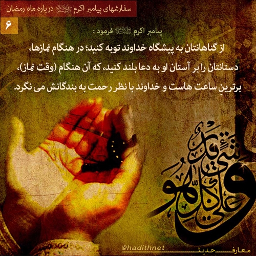 از گناهانتان به پيشگاه خداوند توبه كنيد ؛ در هنگام نمازها ، دستانتان را بر آستان او به دعا بلند كنيد ، كه آن هنگام (وقت نماز) ، برترينِ ساعت هاست و خداوند با نظر رحمت به بندگانش مى نگرد.