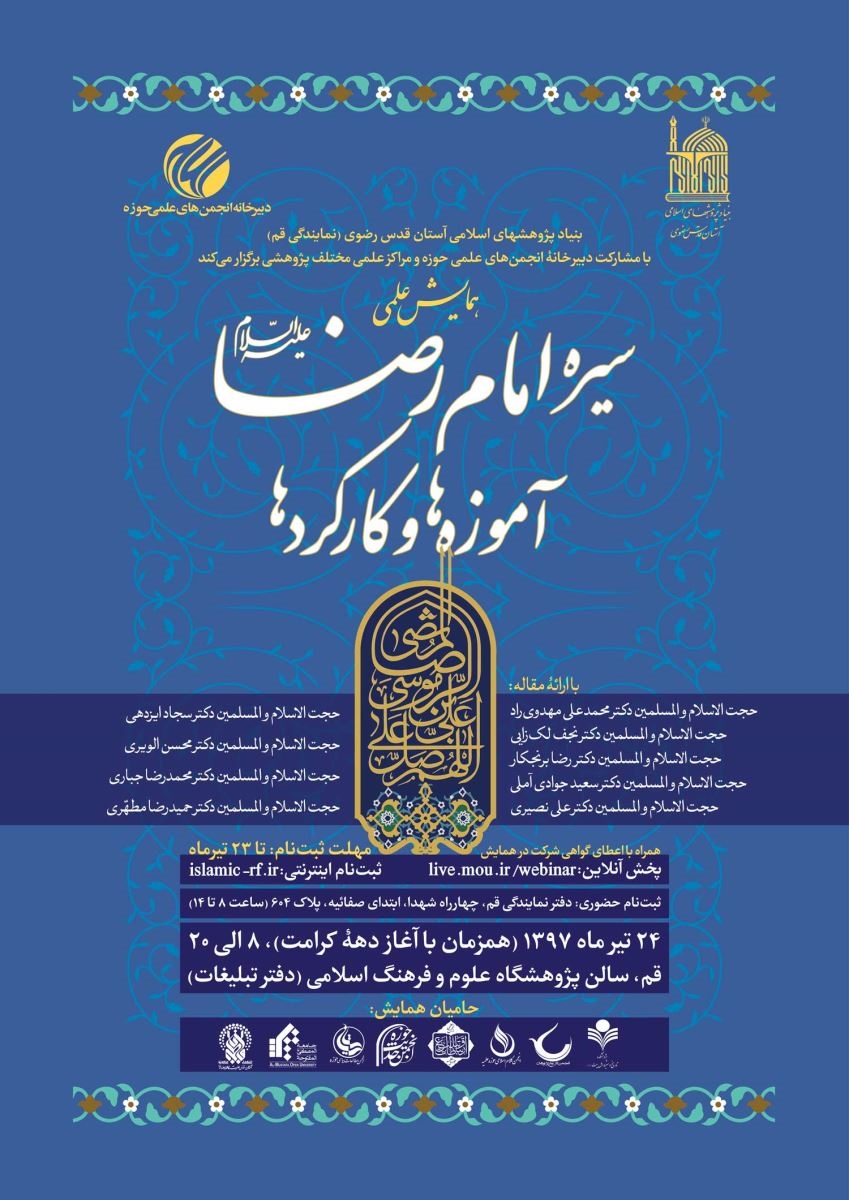 همایش علمی «سیرۀ امام رضا (علیه السلام)؛ آموزهها و کارکردها»، 24 تير ماه 1397، ساعت 8 الي 20 در سالن پژوهشگاه علوم و فرهنگ اسلامي (دفتر تبليغات) شهر قم برگزار خواهد شد. این همایش از حمایت: آستان مقدس حضرت فاطمه معصومه (سلام الله علیها)، جامعه المصطفی المفتوحه، انجمن مطالعات سياسي حوزه، انجمن علمی تبلیغ و ارتباطات حوزه علمیه، انجمن حدیث حوزه علمیه، انجمن تاریخ پژوهشان، پژوهشكده تاريخ و سيرۀ اهل بیت (علیهم السلام) برخوردار خواهد بود.
