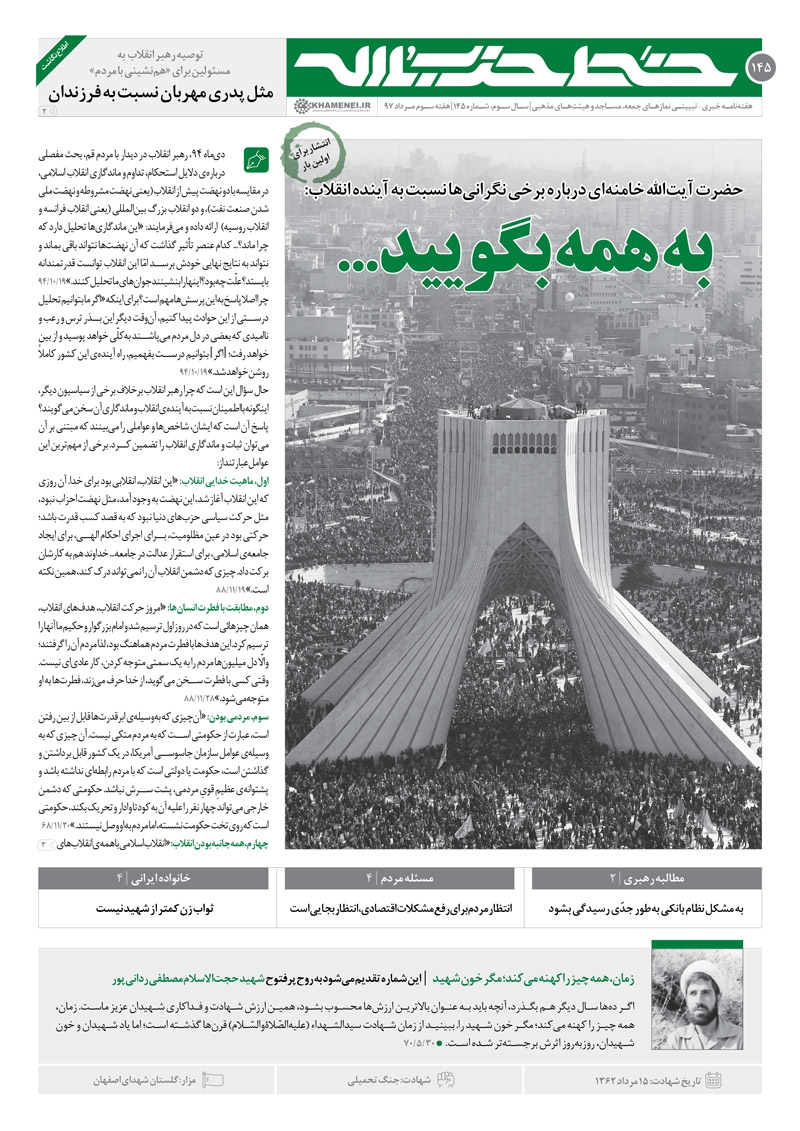اطلاعنگاشت این هفته از نشریه نیز با عنوان «مثل پدری مهربان نسبت به فرزندان» به چند توصیه رهبر انقلاب به مسئولین برای همنشینی و در میان مردم بودن پرداخته است.