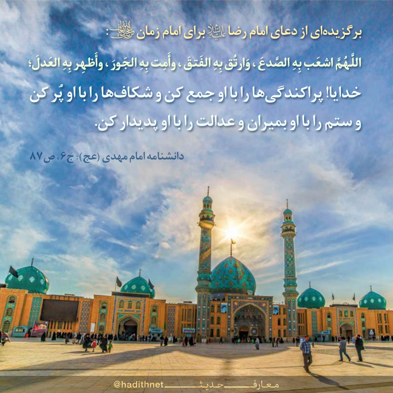 خدايا! پراكندگىها را با او جمع كن و شكافها را با او پُر كن و ستم را با او بميران و عدالت را با او پديدار كن.