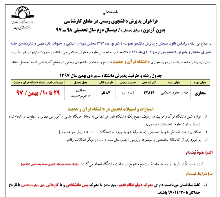 فراخوان تکمیل ظرفیت دانشجوی رسمی در مقطع کارشناسی - بدون آزمون (سوابق تحصیلی) بهمن ماه 97 از سوی مرکز آموزش الکترونیکی دانشگاه قرآن و حدیث(غیر حضوری)