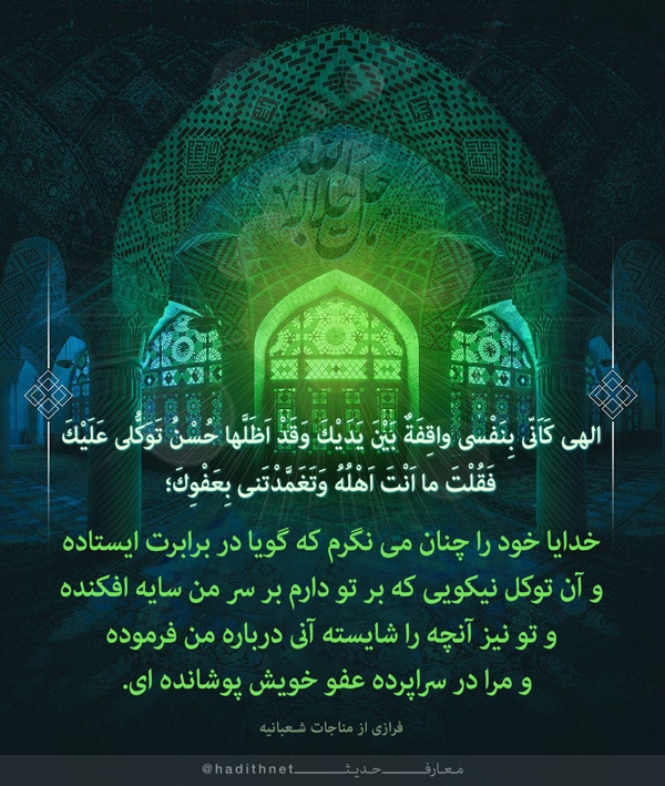 الهى كَاَنّى بِنَفْسى واقِفَةٌ بَيْنَ يَدَيْكَ وَقَدْ اَظَلَّها حُسْنُ تَوَكُّلى عَلَيْكَ فَقُلْتَ ما اَنْتَ اَهْلُهُ وَتَغَمَّدْتَنى بِعَفْوِكَ؛