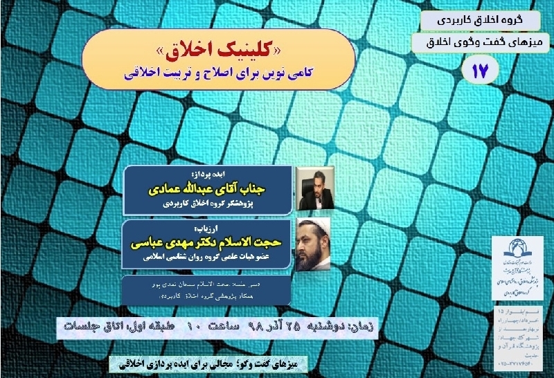 به همت گروه اخلاق کاربردی پژوهشکده اخلاق و روان شناسی اسلامی، هفدهمین میز گفت و گوی اخلاق با عنوان کلینیک اخلاق؛ گامی نوین برای اصلاح و تربیت اخلاقی برگزار می شود.