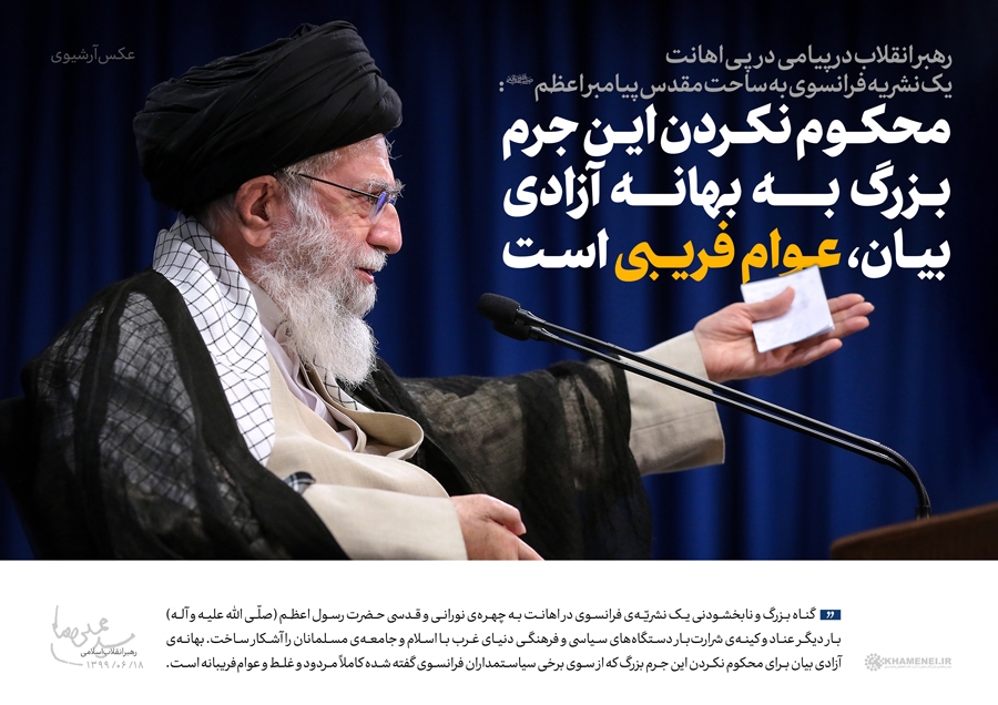 حضرت آیتالله خامنهای در پیامی ضمن محکومکردن اهانت اخیر یک نشریه فرانسوی به ساحت نورانی پیامبر اعظم صلّیاللهعلیهوآلهوسلّم تصریح کردند: بهانه آزادی بیان برای محکوم نکردن این جرم بزرگ که از سوی برخی سیاستمداران فرانسوی گفته شده کاملاً مردود و غلط و عوامفریبانه است.