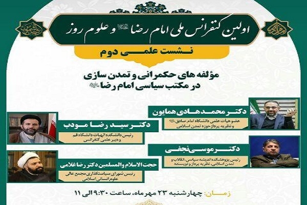 نشست دوم از اولین کنفرانس ملی امام رضا(ع) و علوم روز با موضوع «مؤلفه‌های حکمرانی و تمدن‌سازی در مکتب سیاسی امام رضا(ع)» برگزار می‌شود.